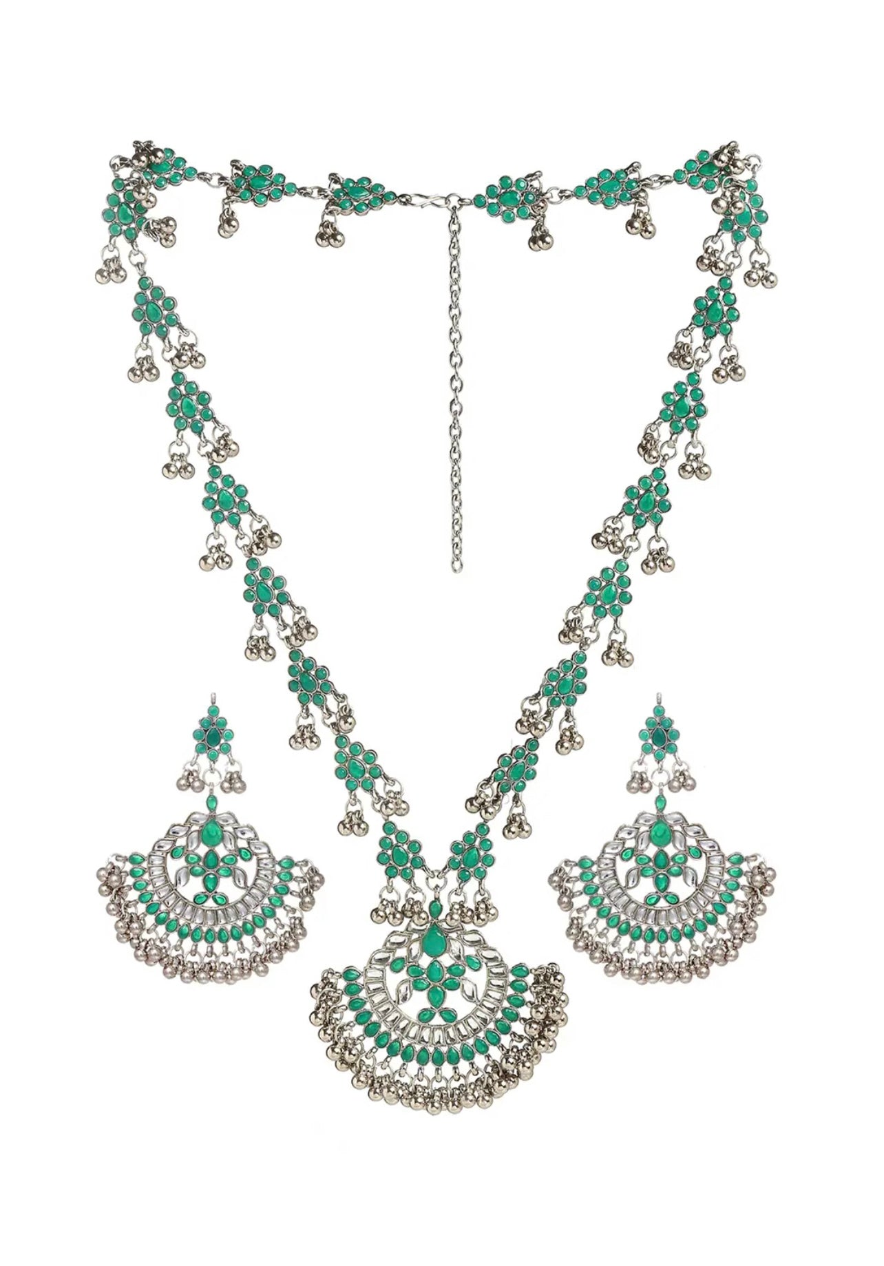 Beautifully crafted Green heavy Oxidized long necklace set with big drop earrings. Goes well on all your outfits whether traditional or western.