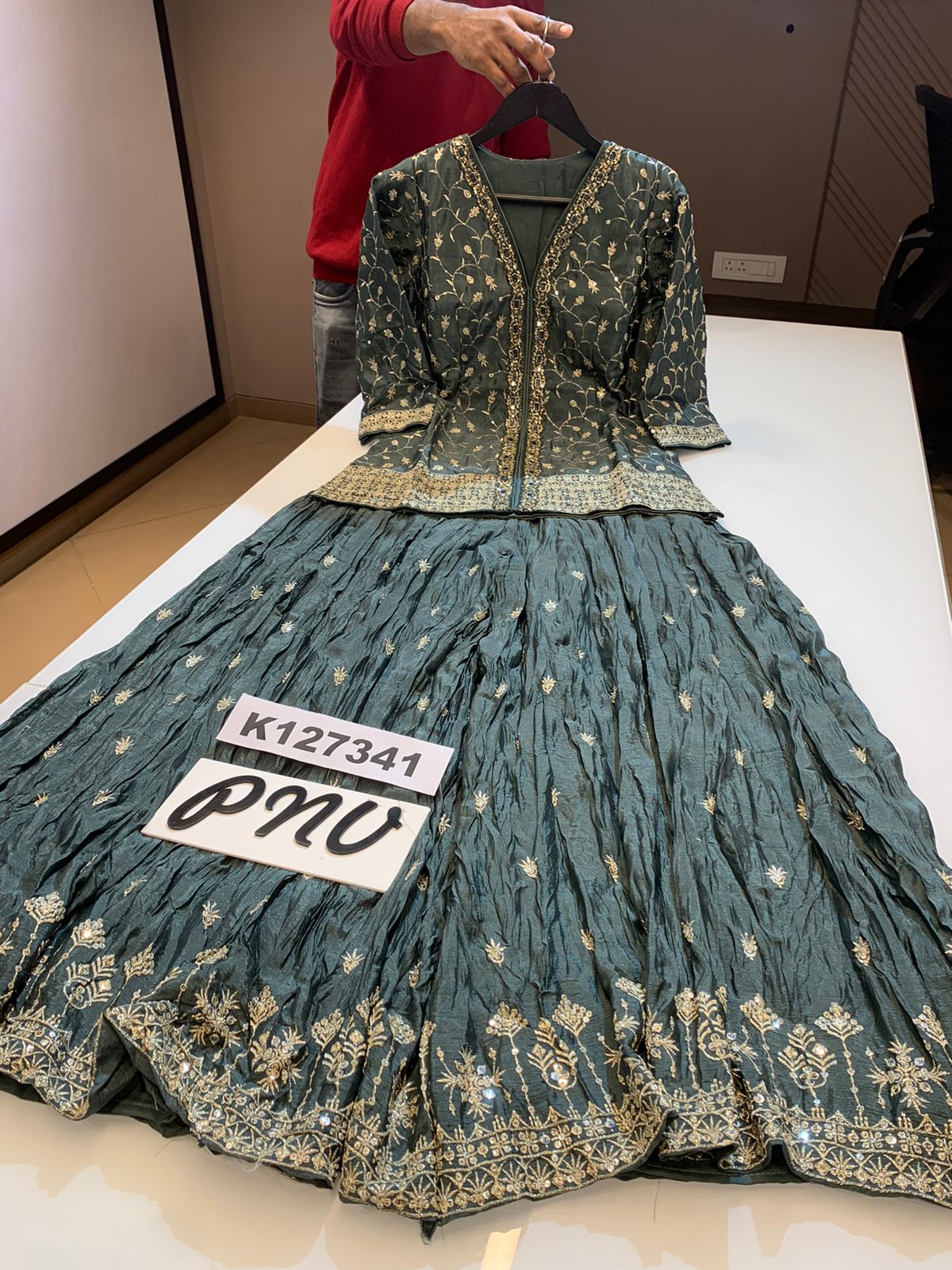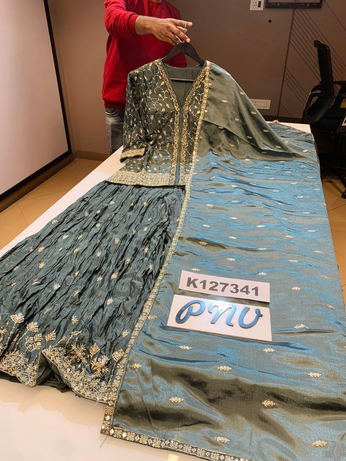 Grey elegant partywear heavy handwork sharara suit cum lehenga