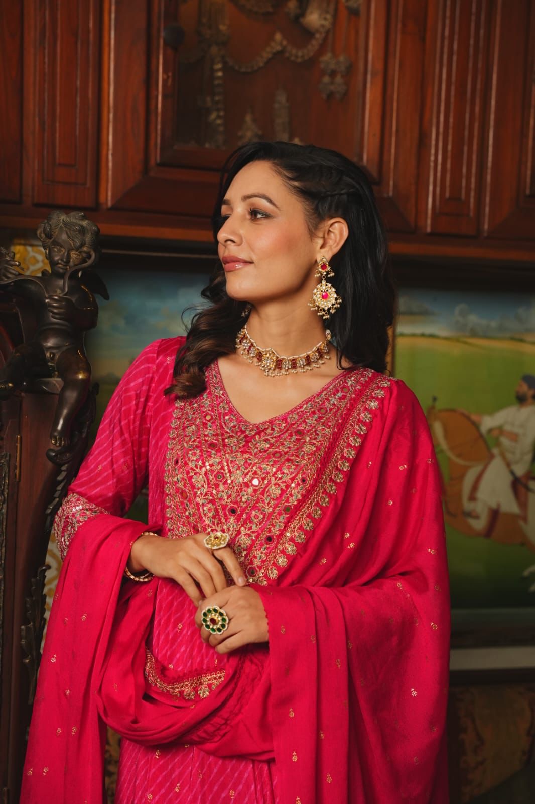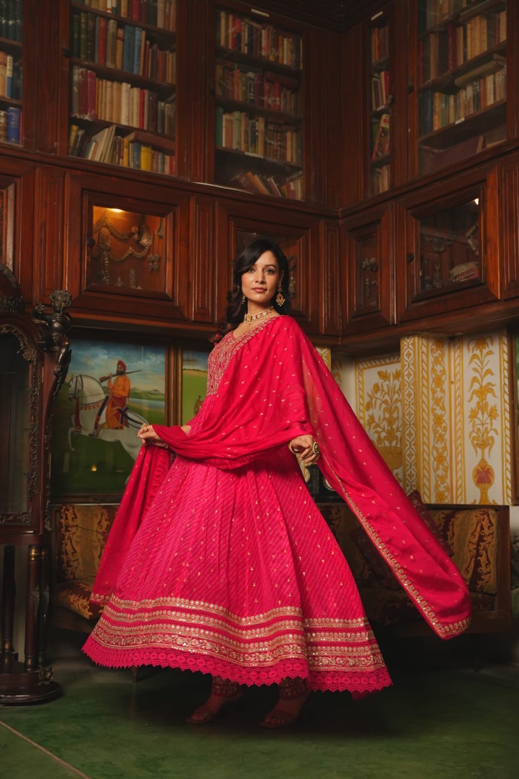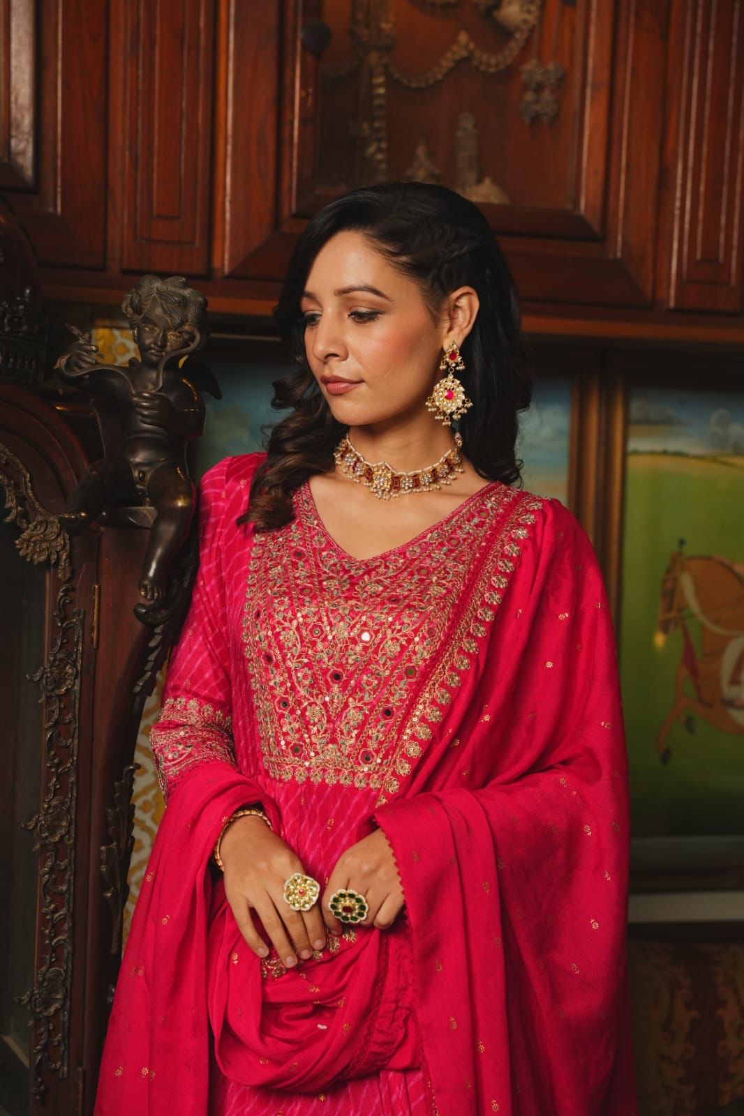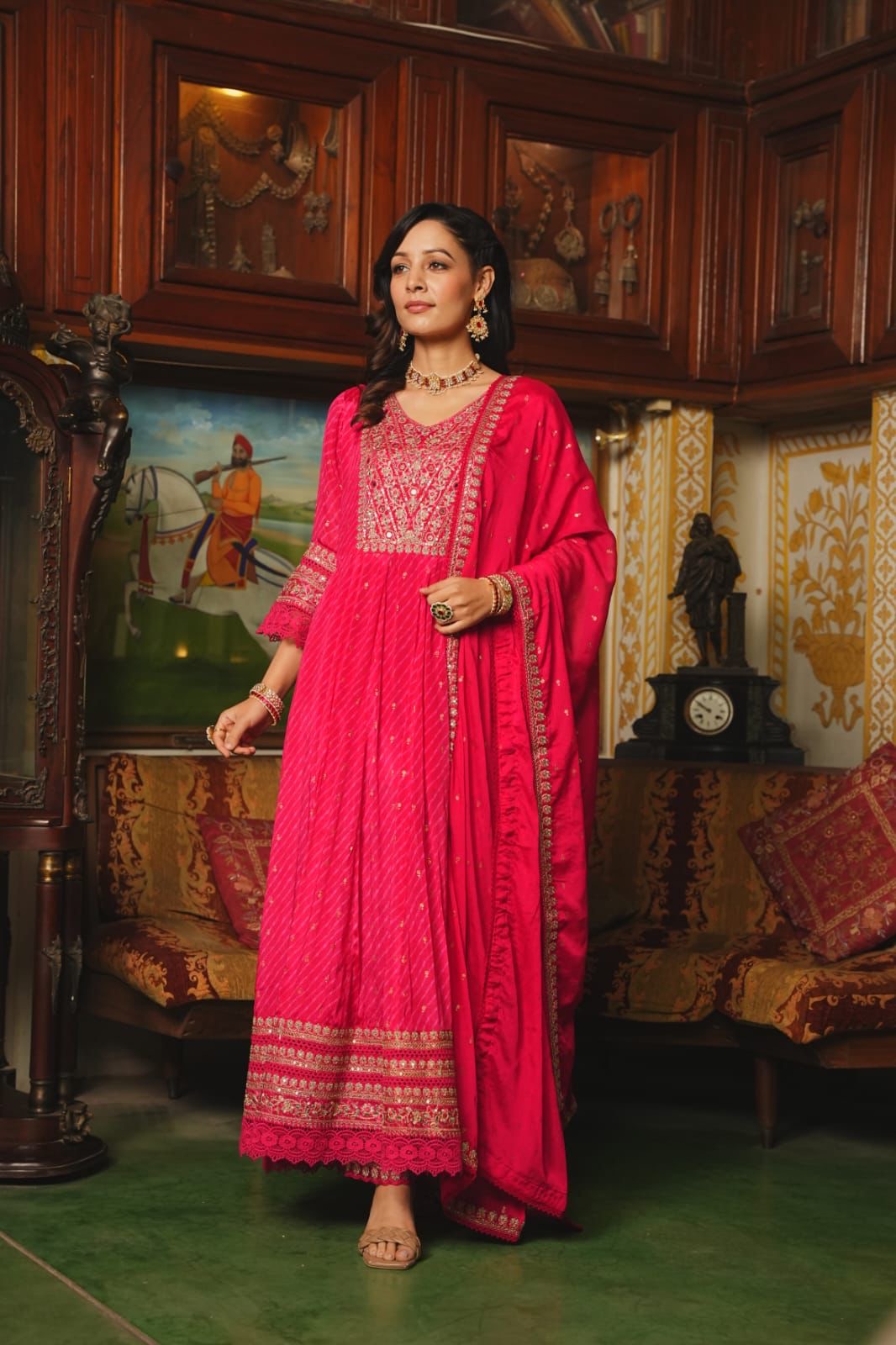 Hot pink premium chinnon silk anarkali suit with heavy work