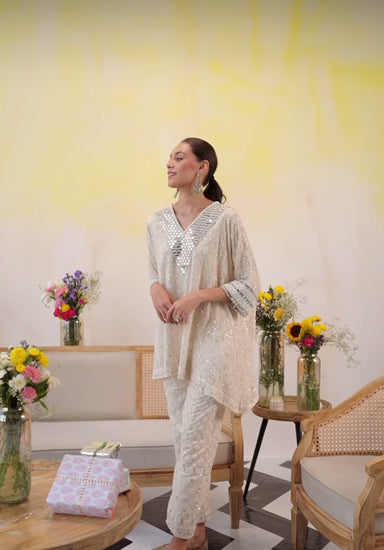 Off White chikankari Heavy real Mirror kaftan co-ord set