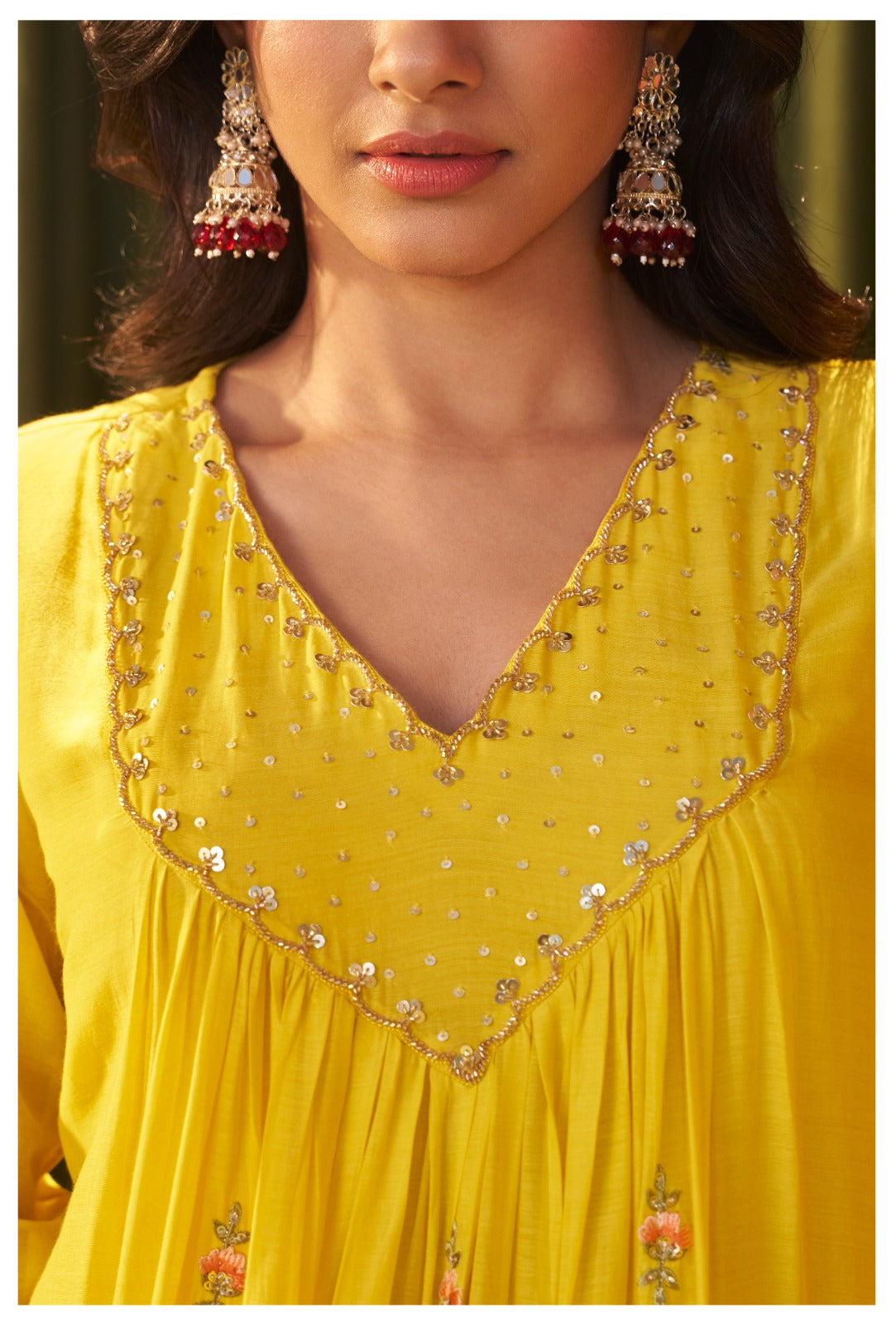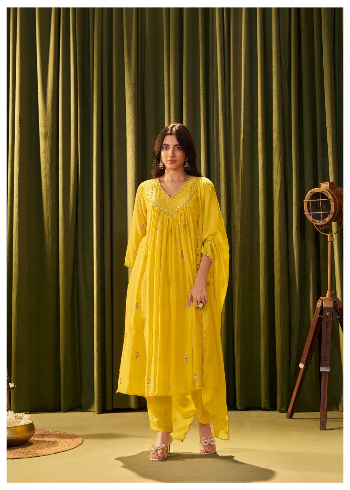 Yellow pure mul chanderi handwork yoke suit